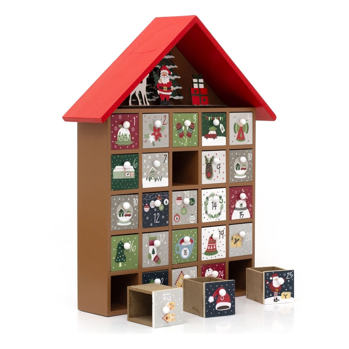 ADVENT CALENDAR | A delightful advent calendar in the shape of a cosy red-roofed house with cheerful Christmas prints on each drawer, including Santa, reindeer, baubles, and more