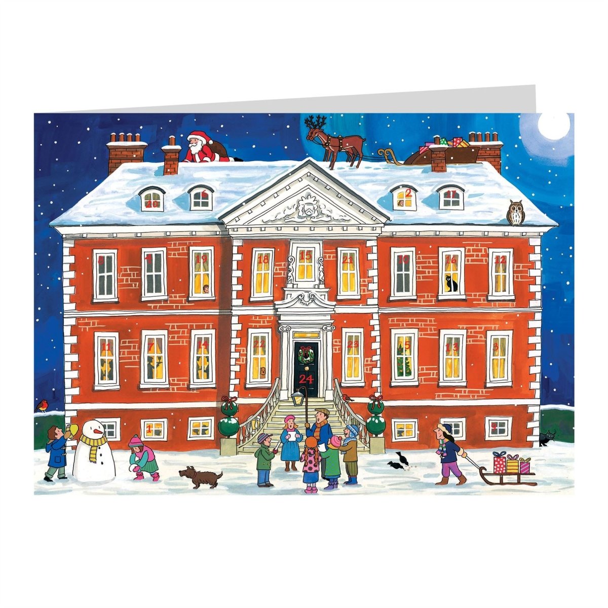 CHRISTMAS ADVENT CALENDAR | Bring the magic of Christmas to life with our Country House Advent Card. The card features a whimsical winter scene at a beautifully decorated country house, where carol singers fill the air with music, children build a snowman, and Santa sneaks in to fill the stockings with presents