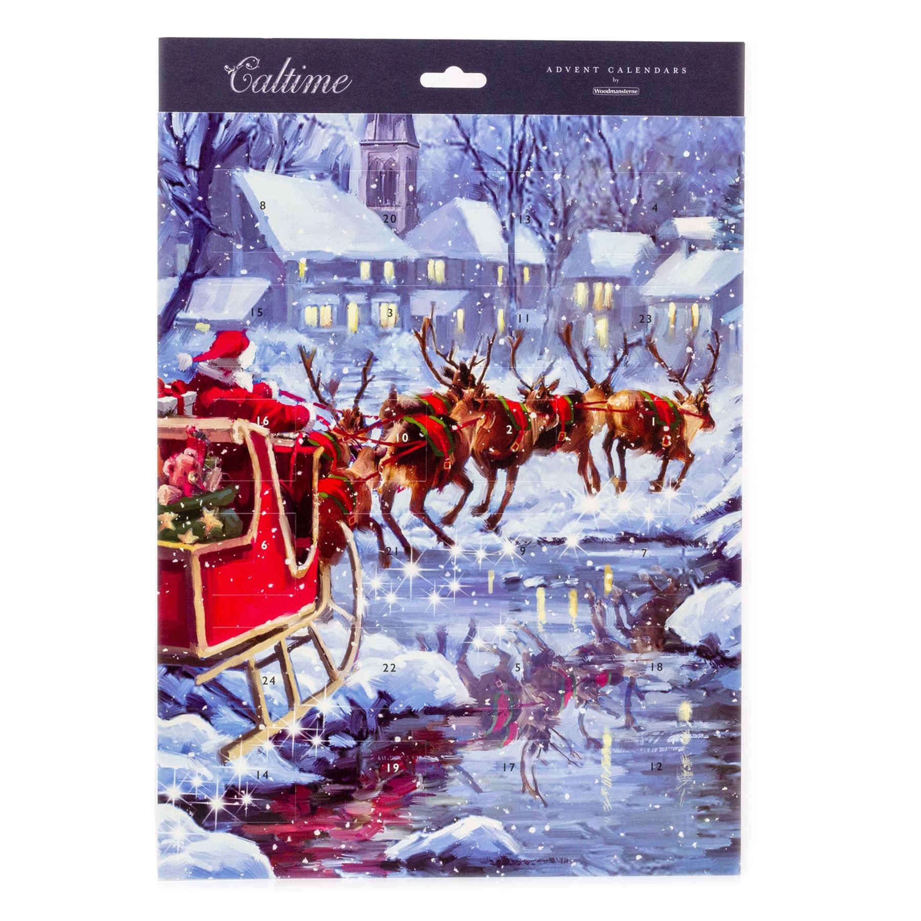 CHRISTMAS ADVENT CALENDAR | Add to the enchantment of Christmas with this beautifully illustrated advent calendar featuring Santa Claus and his reindeer gliding through a snowy village. Each day reveals a new detail, bringing the festive town to life