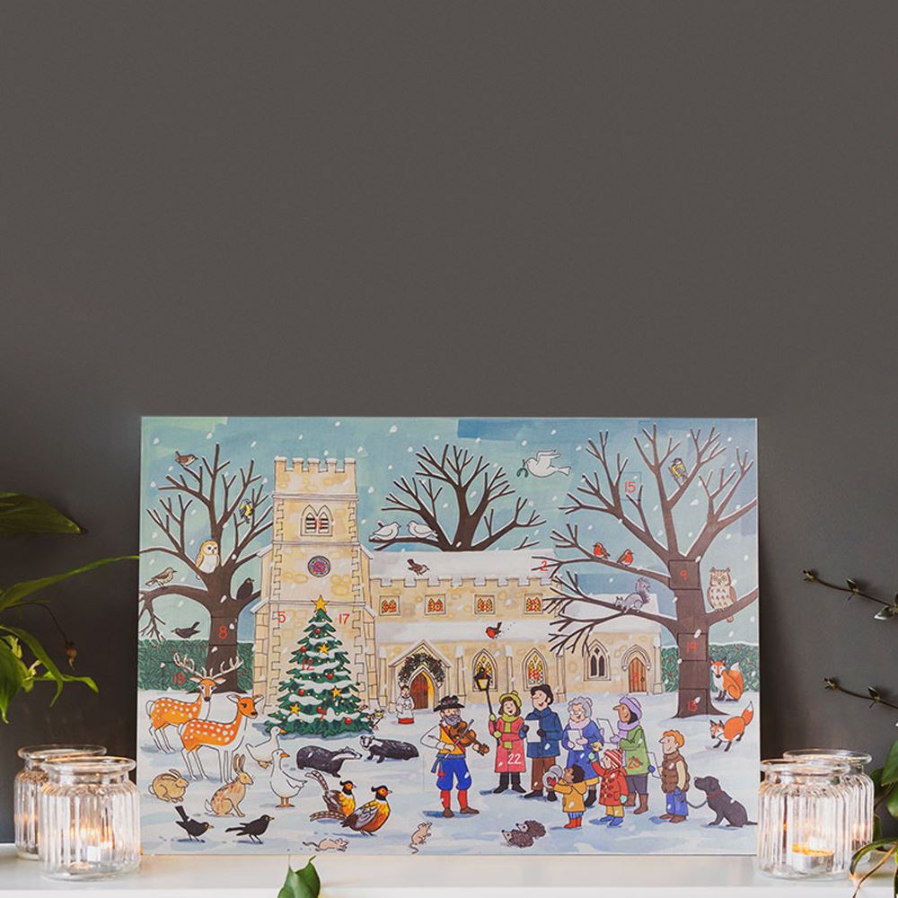 Celebrate Christmas with our Winter Wildlife Advent Calendar, featuring a picturesque English church and England's iconic winter animals. This traditional, chocolate-free advent calendar reveals a festive scene behind each window, Perfect as a gift or as
