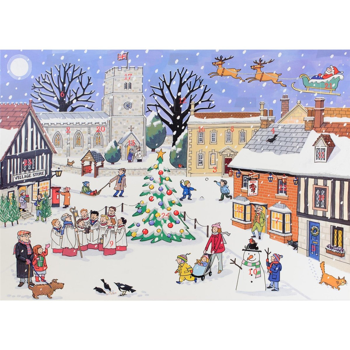 A beautifully illustrated Advent calendar featuring a joyful festive scene