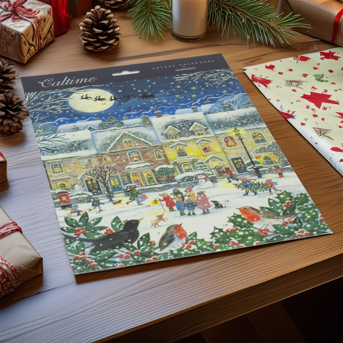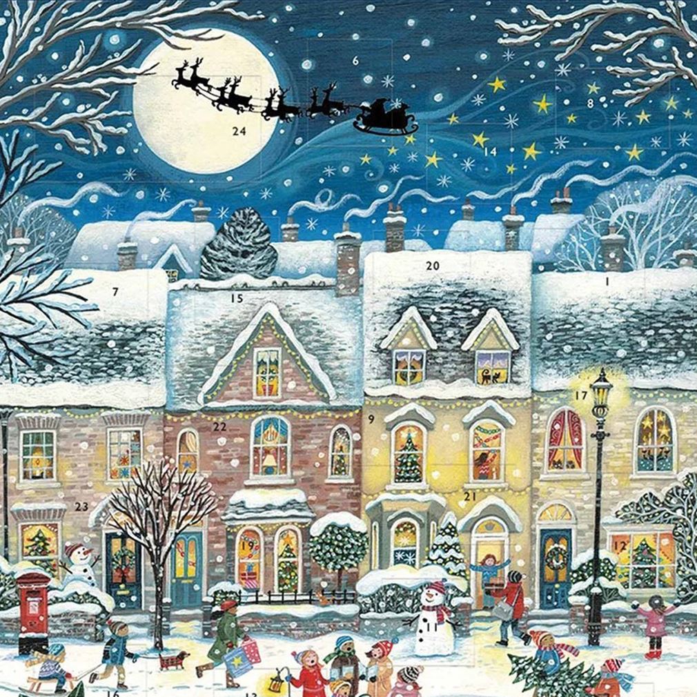 ADVENT CALENDAR | A traditional picture advent calendar with a vibrant festive village, Santa’s sleigh in the sky, and 24 doors to open