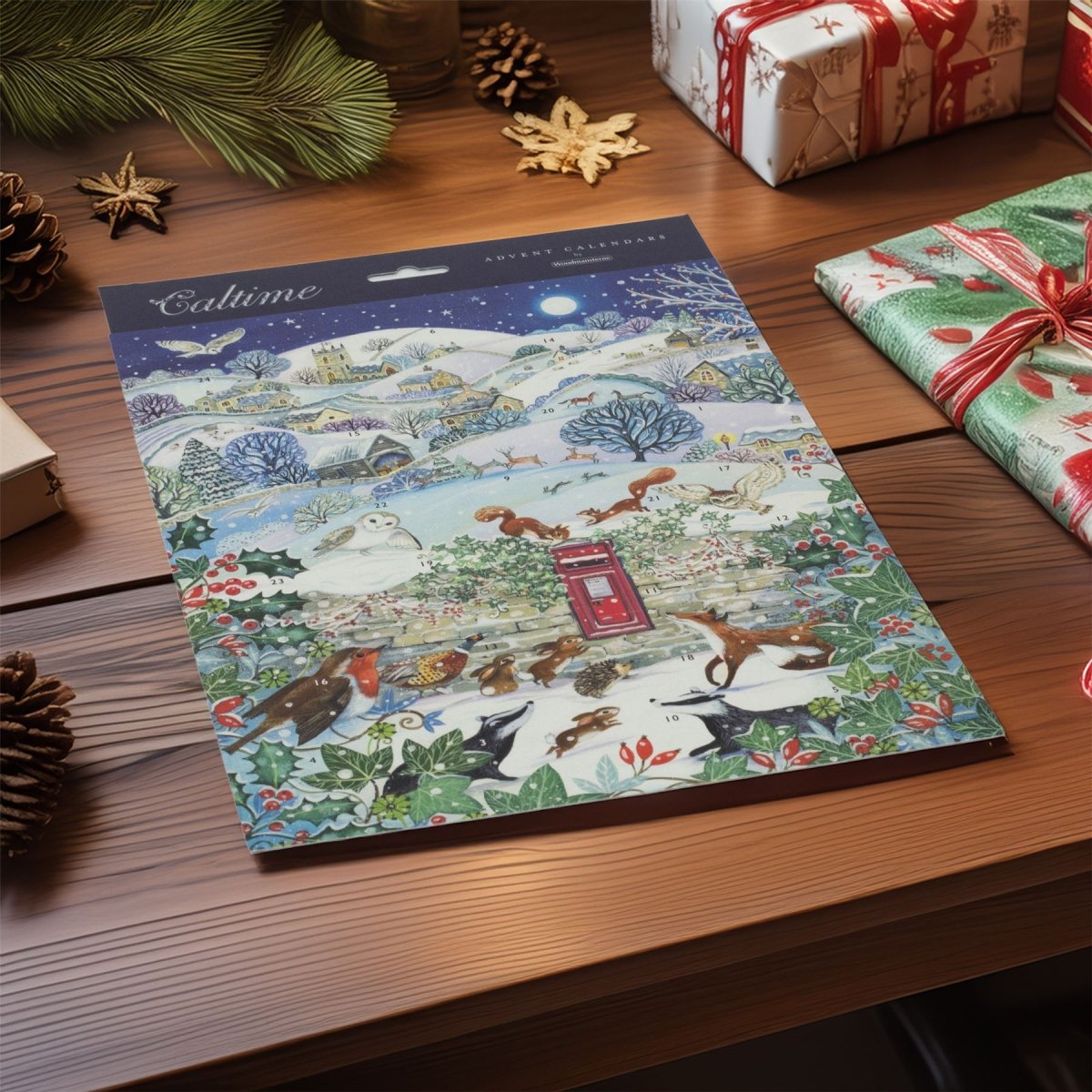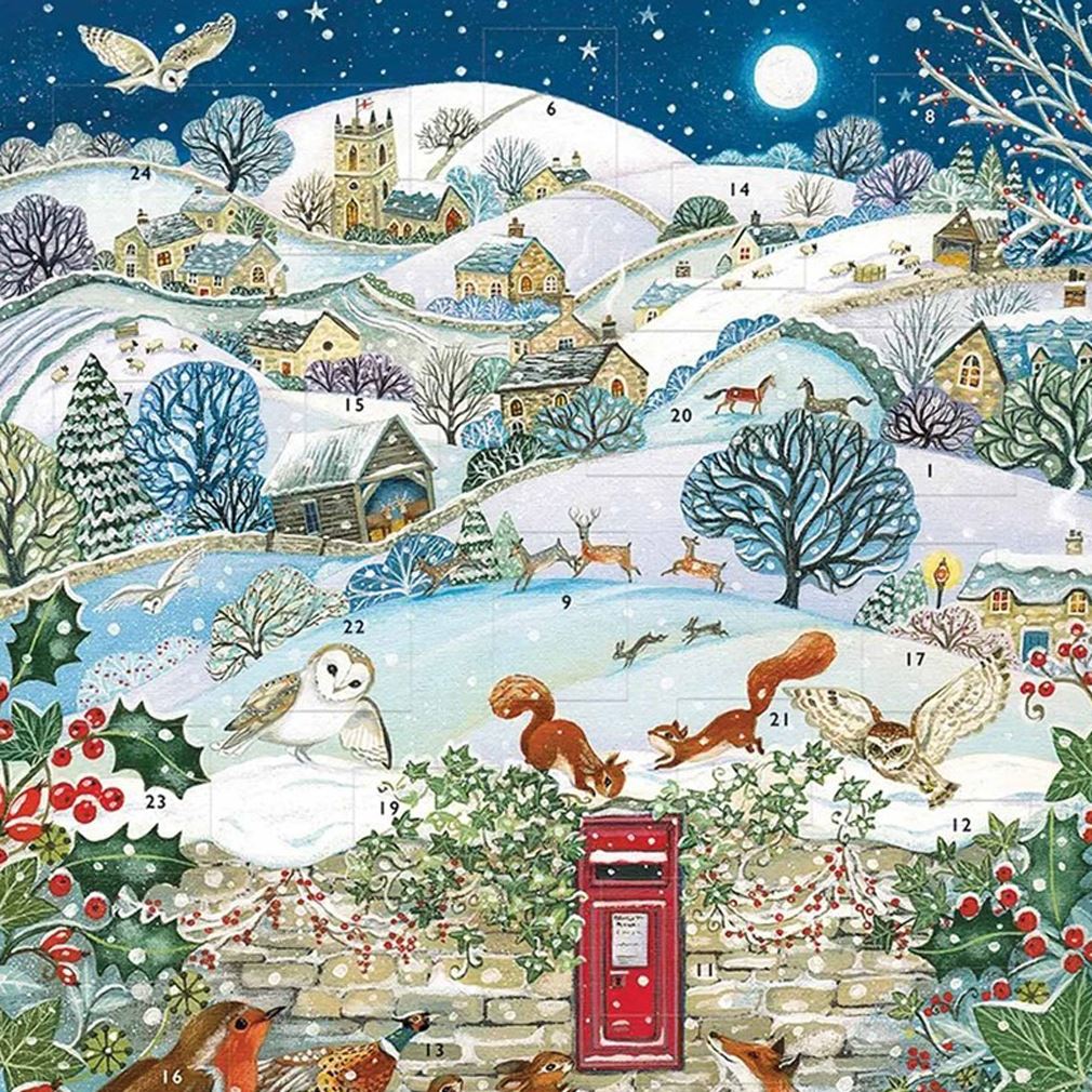 Celebrate the countdown to Christmas with this delightful Over the Fields advent calendar, featuring a snowy village scene with woodland animals and a charming red letterbox