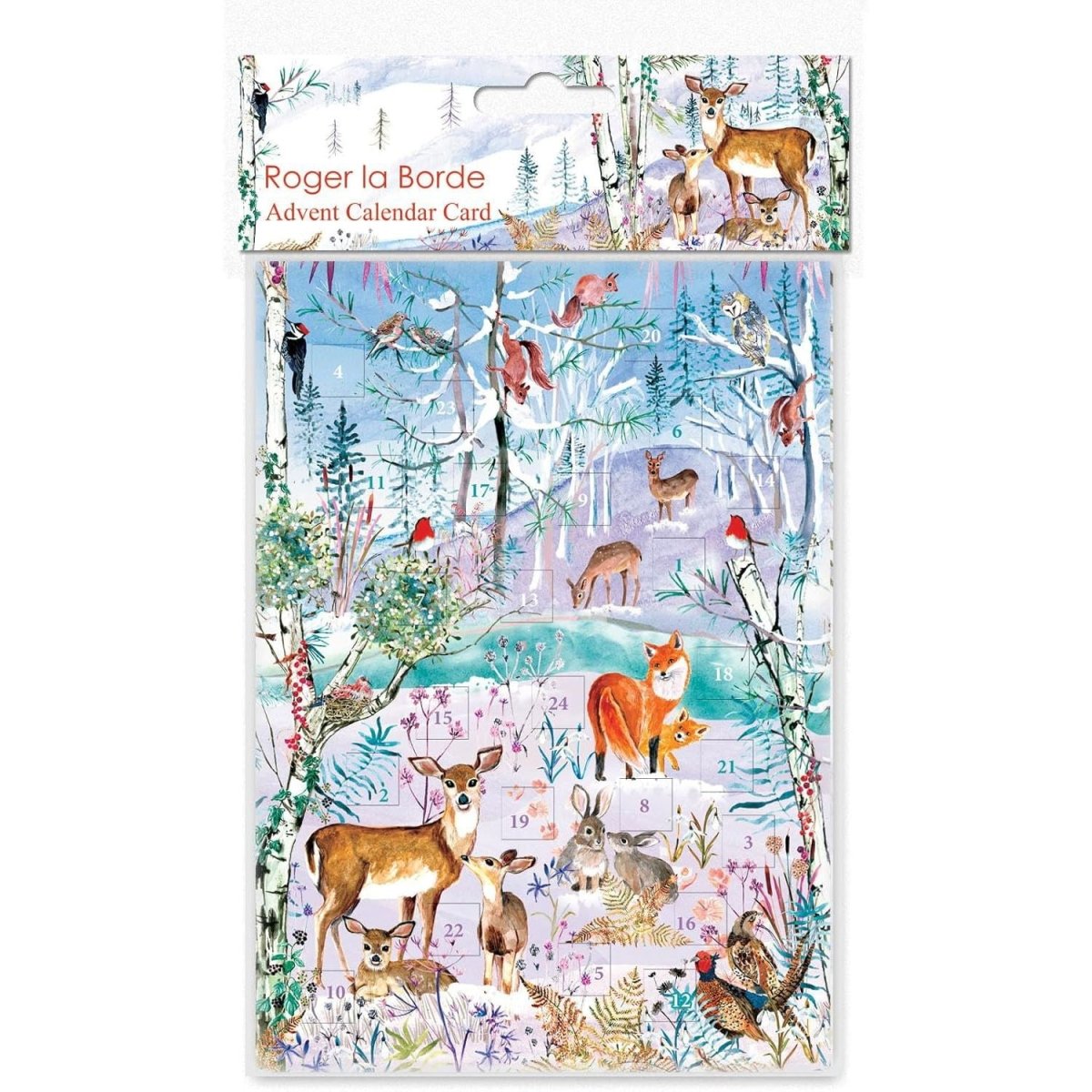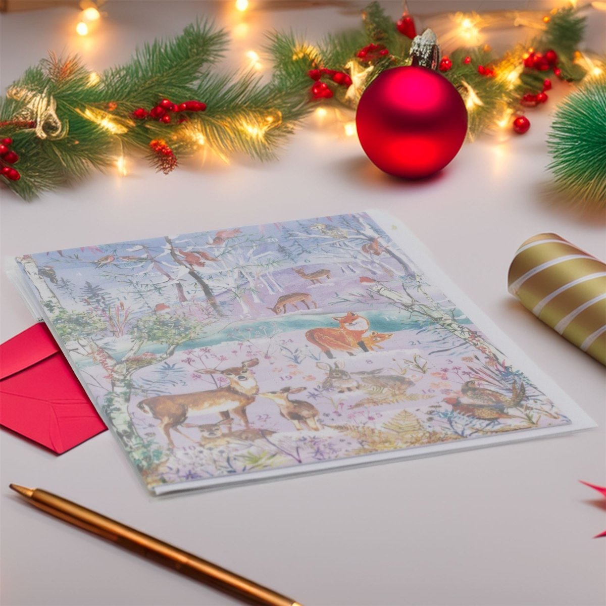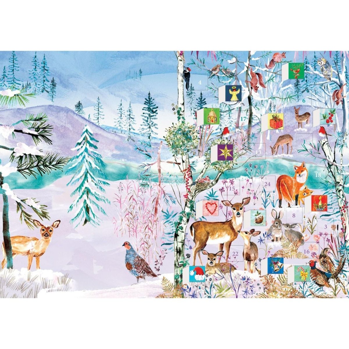 ADVENT GREETINGS CARD | A delightful advent card featuring a snowy woodland scene of rabbits, deers, and flora, with 24 doors to open each day