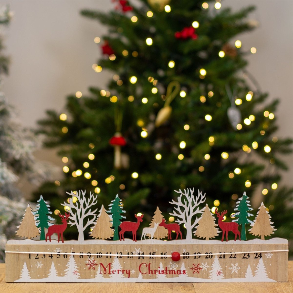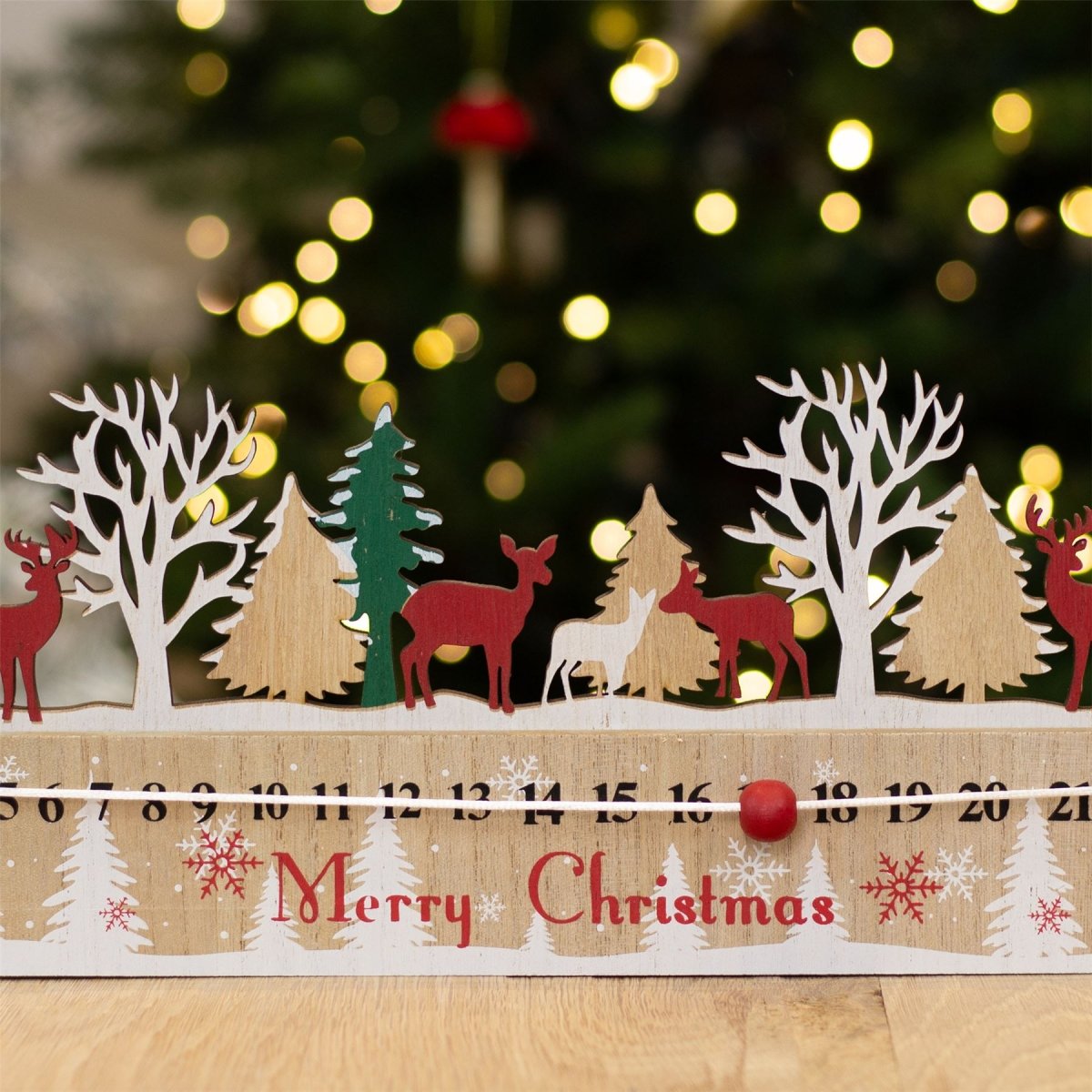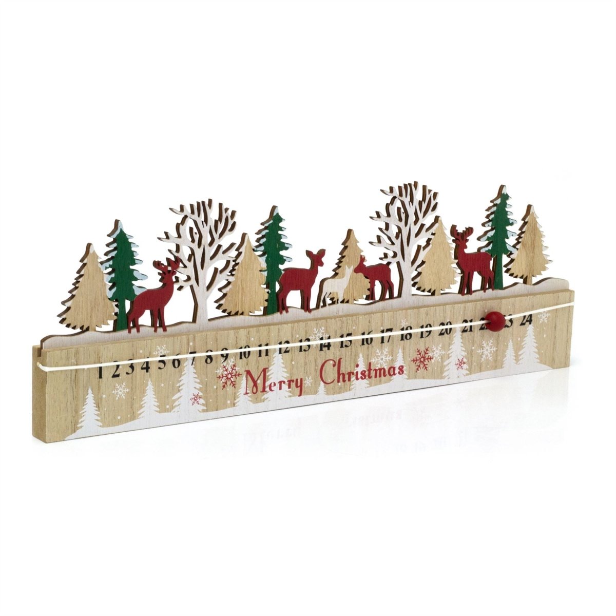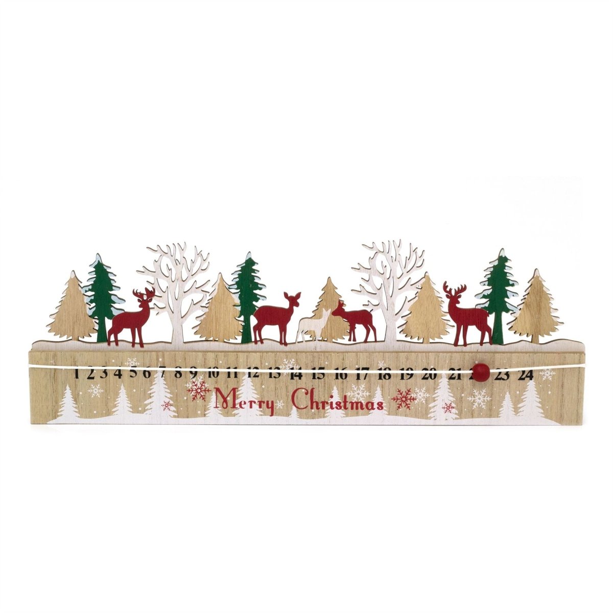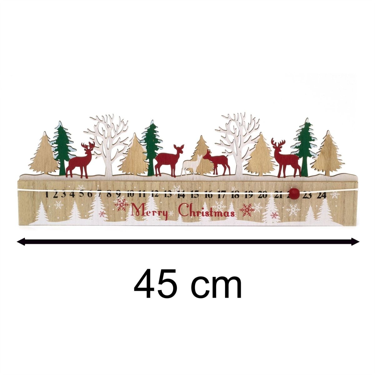 REINDEER ADVENT CALENDAR | This charming wooden advent calendar showcases a stunning Alpine forest scene filled with trees and deer. The base is adorned with snowflakes and the cheerful wording 'Merry Christmas,' making it a perfect addition to your home that adds a touch of festive magic