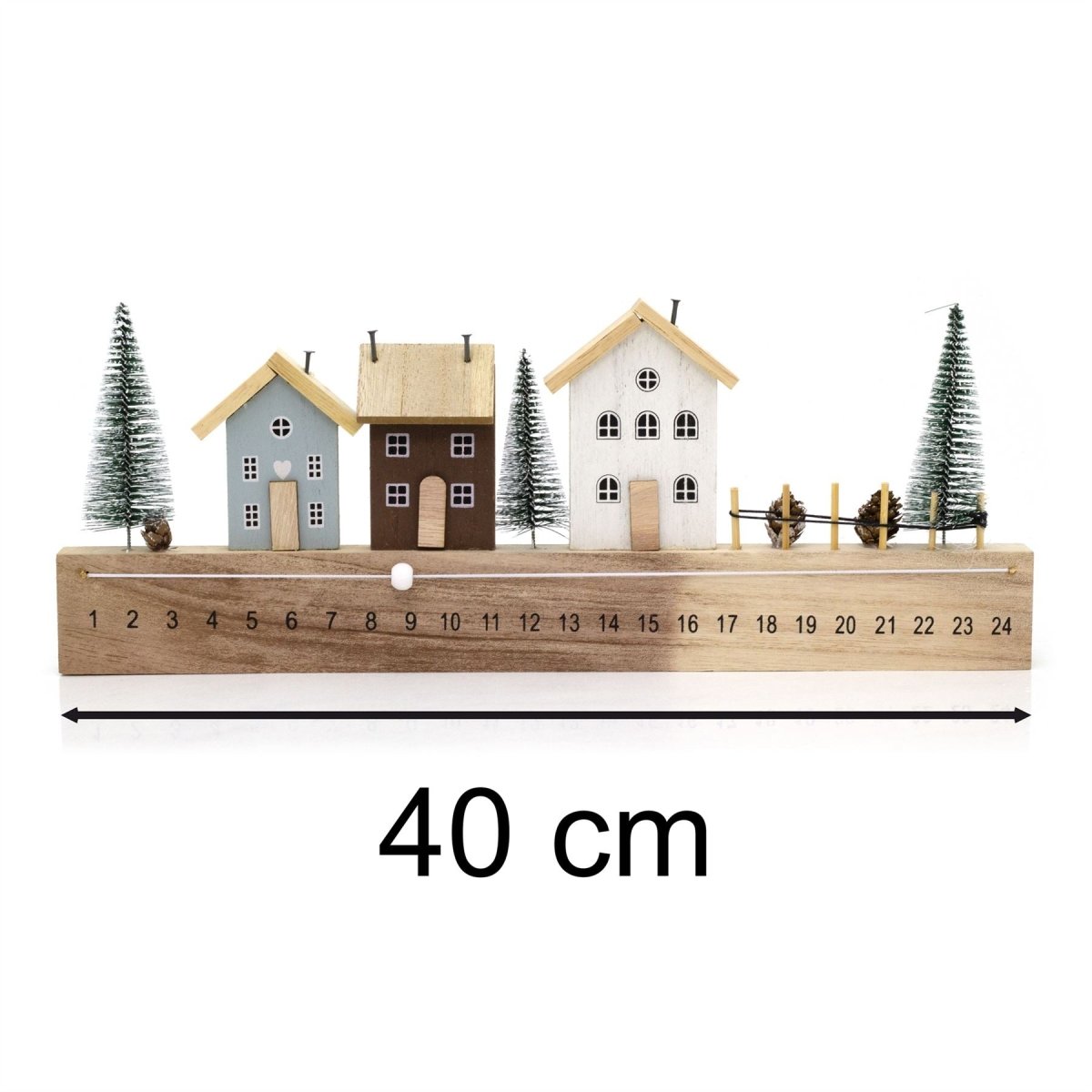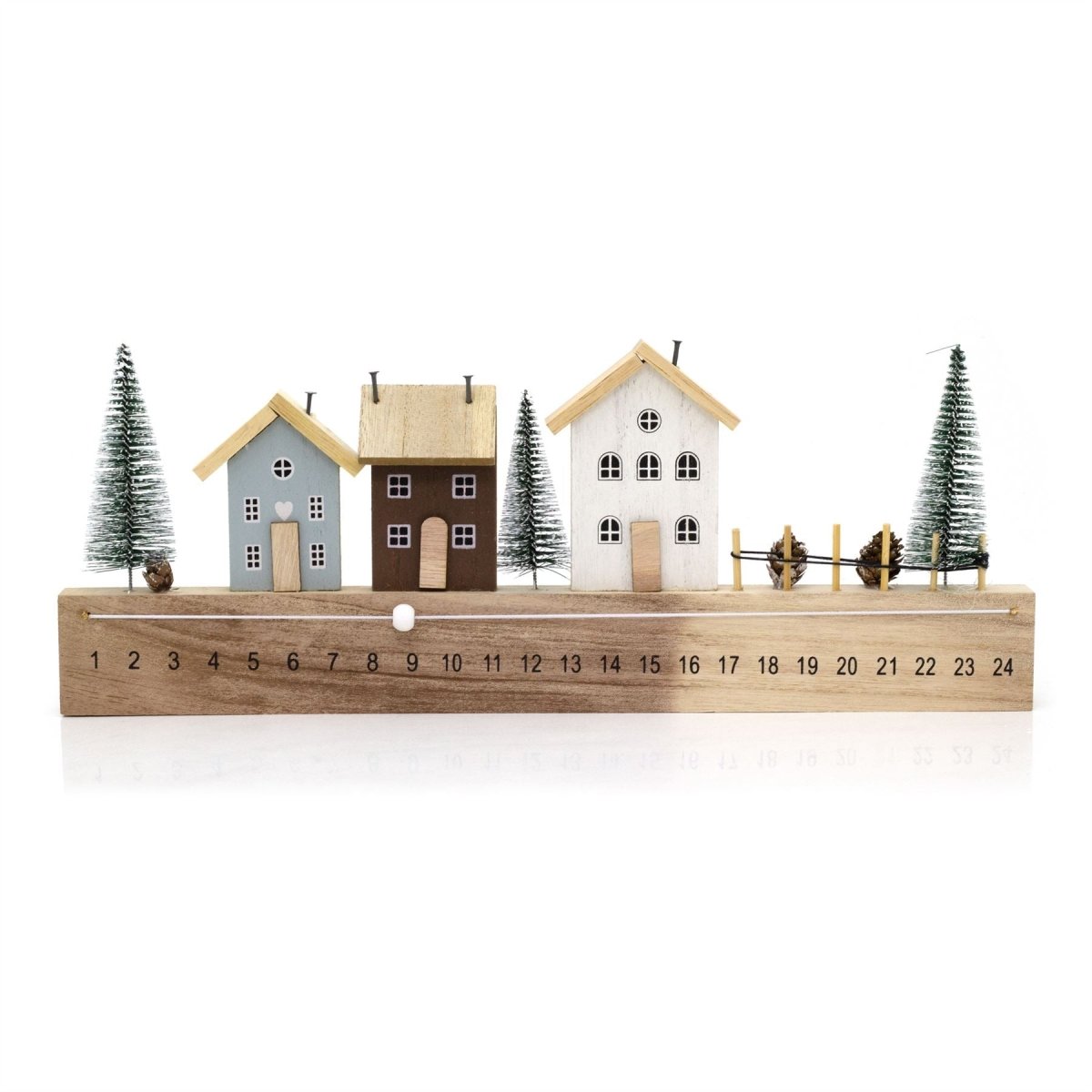 CHARMING TOWNHOUSE SCENE | Countdown to Christmas with our Townhouse Christmas Advent Calendar. This charming wooden calendar features a lovely row of detailed townhouses adorned with pinecones and bottlebrush Christmas trees, creating an enchanting festive scene