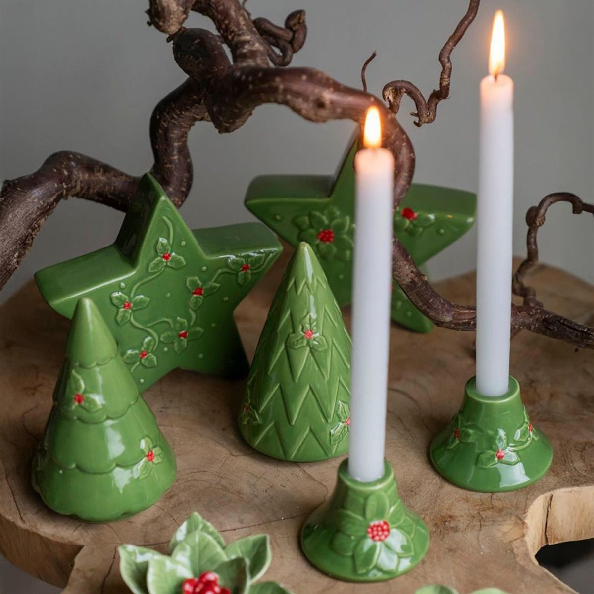 Bring warmth to your festive setup with this set of two ceramic holly candlesticks. Each design holds taper candles beautifully and adds a bright seasonal touch