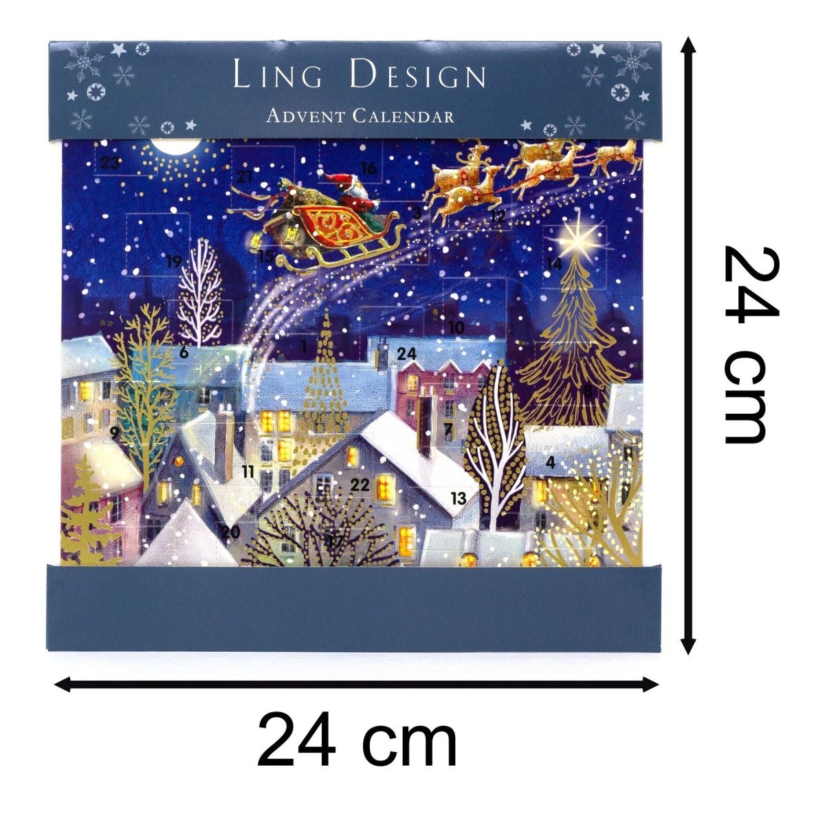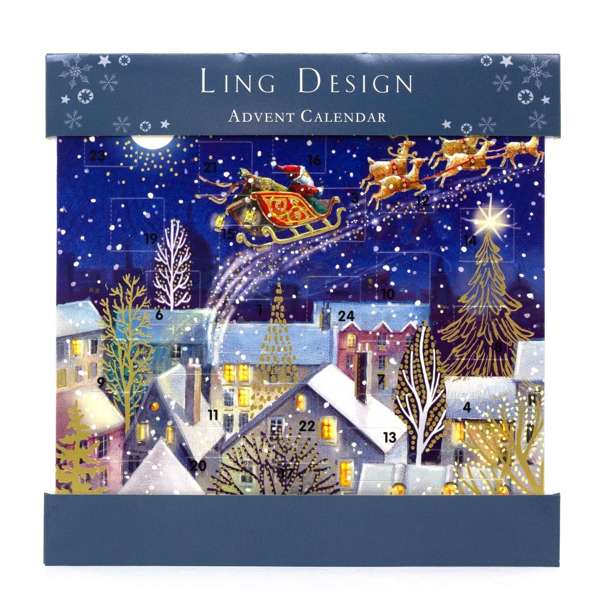 PICTURE ADVENT CALENDAR | This picture advent calendar features a magical scene of Santa Claus soaring over a snowy, moonlit town in his sleigh. The charming details and gold accents perfectly capture the festive spirit